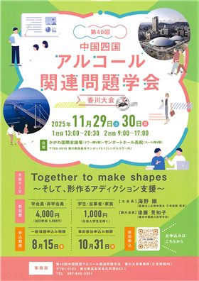 イベント情報 いたみ診療講演会 2025/12/10 講演会名称 いたみ診療講演会 開始時間 19:00 開催場所 Web形式 お問い合わせはこちら ▲ Pagetop 第40回中国四国アルコール関連問題学会 香川大会 2025/11/29 講演会名称 第40回中国四国アルコール関連問題学会 香川大会 開始時間 13:00 開催場所 かがわ国際会議場、サンポートホール高松 お問い合わせはこちら ▲ Pagetop