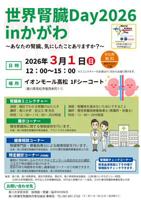 イベント情報 第26回日本死の臨床研究会 中国・四国支部大会 2026/04/19 講演会名称 第26回日本死の臨床研究会 中国・四国支部大会 開始時間 09:00 開催場所 サンポートホール高松 お問い合わせはこちら ▲ Pagetop 世界腎臓デー2026inかがわ~あなたの腎臓、気にしたことありますか?~ 2026/03/01 講演会名称 世界腎臓デー2026inかがわ~あなたの腎臓、気にしたことありますか?~ 開始時間 12:00 開催場所 イオンモール高松 お問い合わせはこちら ▲ Pagetop